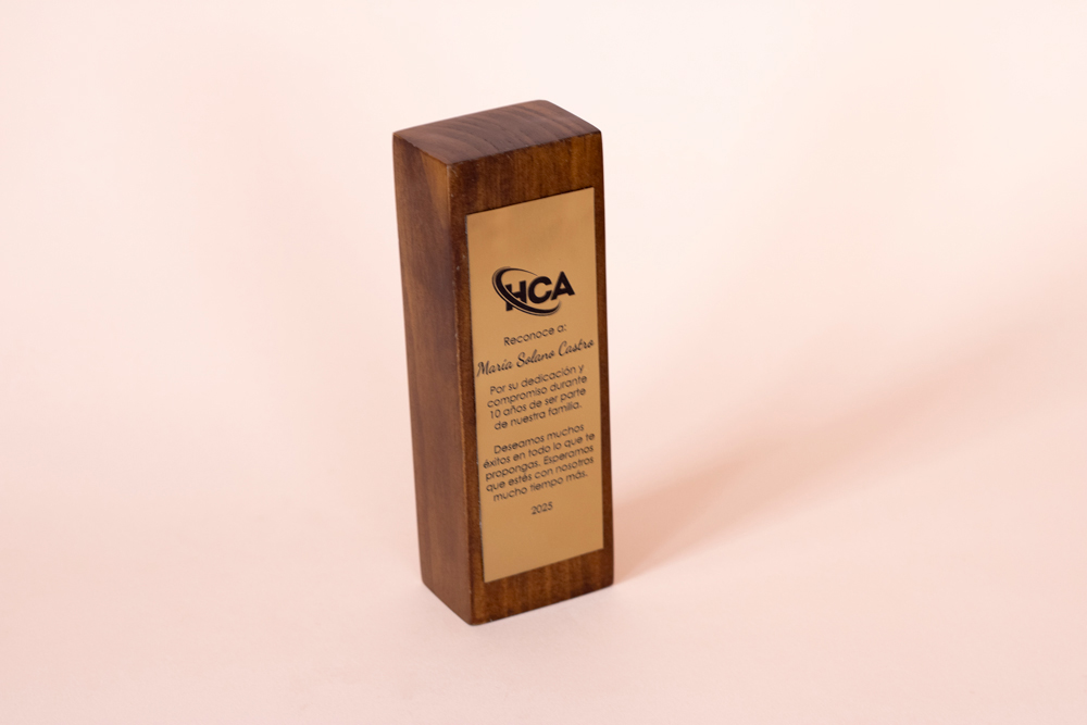 Este reconocimiento de madera con placa grabada es una pieza funcional y representativa, diseñada para permanecer en el tiempo como símbolo tangible de reconocimiento y gratitud.